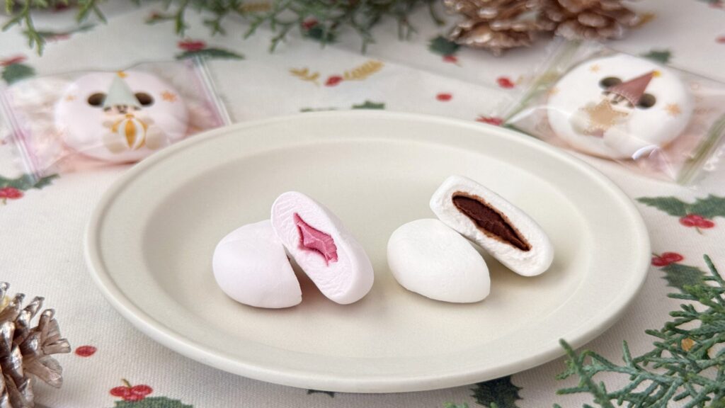 The white marshmallow releases a rich chocolate aroma, creating a harmonious balance between its soft, fluffy texture and melt-in-your-mouth feel. The faintly pink marshmallow exudes a deep, rich strawberry sweetness, and its milky strawberry flavor pairs perfectly with its creamy texture.They are paired with slightly sticky chocolate cream. The gentle sweetness of the marshmallow blends perfectly with the equally gentle sweetness of the chocolate cream.