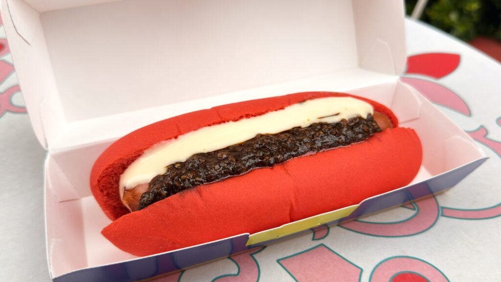 ディズニーランドの「リフレッシュメントコーナー」で販売されている、ハロウィンパッケージに入っている限定メニューの「スペシャルホットドッグ(スウィートチリ・ミートソース&チーズソース)」です。ディズニー映画「101匹わんちゃん」に登場するクルエラ・ド・ビルをイメージしたホットドッグで、黒いミートソース白いチーズソースに、甘辛いスウィートチリがアクセントになっています。