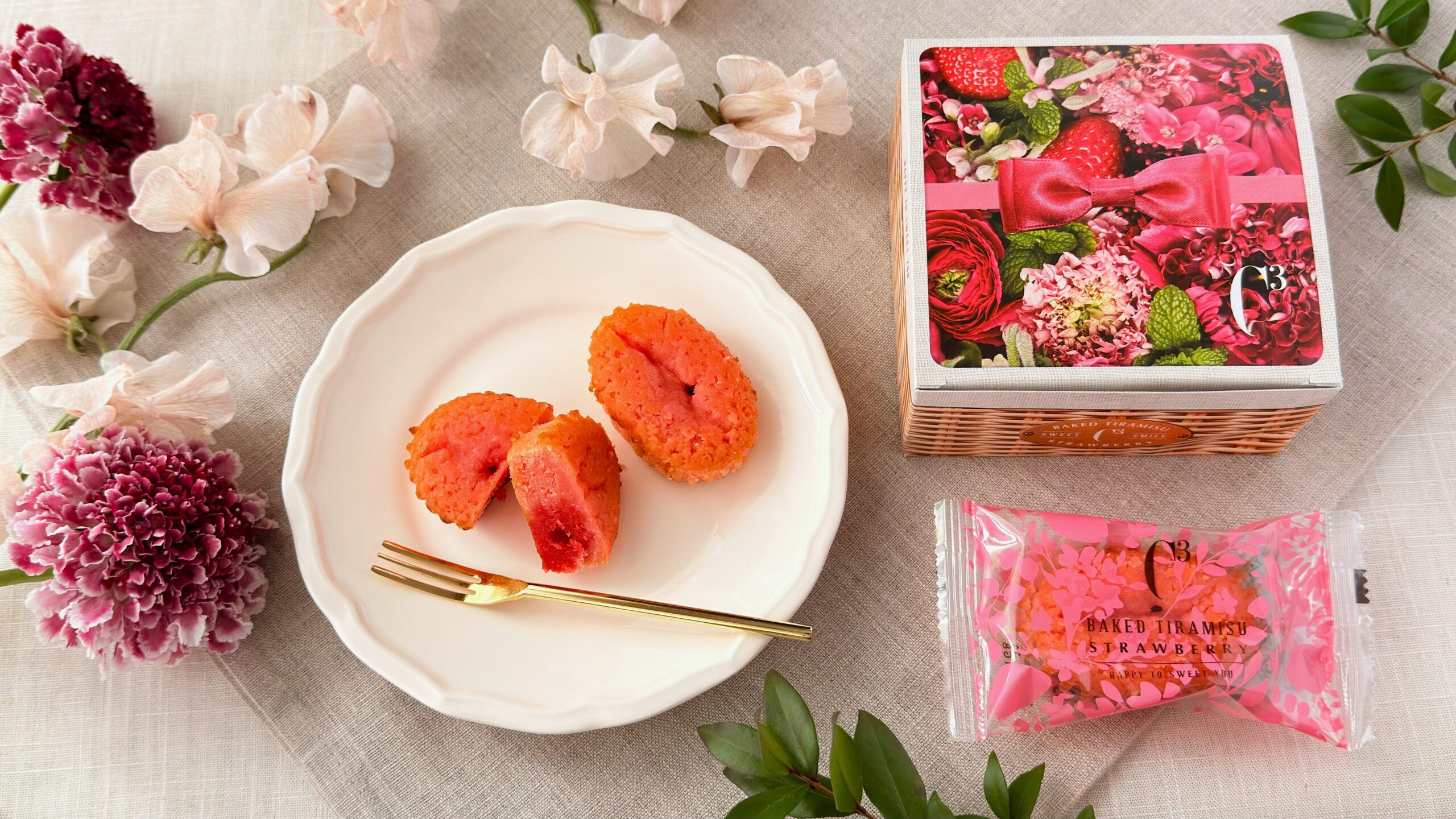 春のギフトにぴったりな可愛らしいデザインの箱入りで、パッケージやお菓子の見た目からも春らしさを満喫できるのが魅力です。また焼きティラミスのしっとりとした口当たりや味わいのバランスを、いちごの甘さや酸味のハーモニーとして満喫でき、華やぐいちご感を堪能できました。ぜひ春のギフトやティータイムのお供に、春色に染まった焼きティラミスを手に取ってみてはいかがでしょうか。