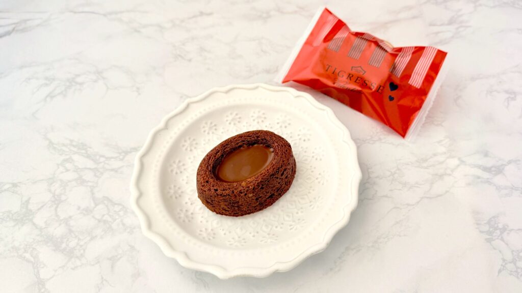 鮮やかなオレンジ色のパッケージに身を包んでいる「ティグレス」です。生地にはアーモンドプードルと焦がしバターを使用し、チョコチップが練り込まれています。中央のくぼみにはチョコレートが流し込まれた、バターとチョコレートのリッチ感が人気の定番ティグレスです。