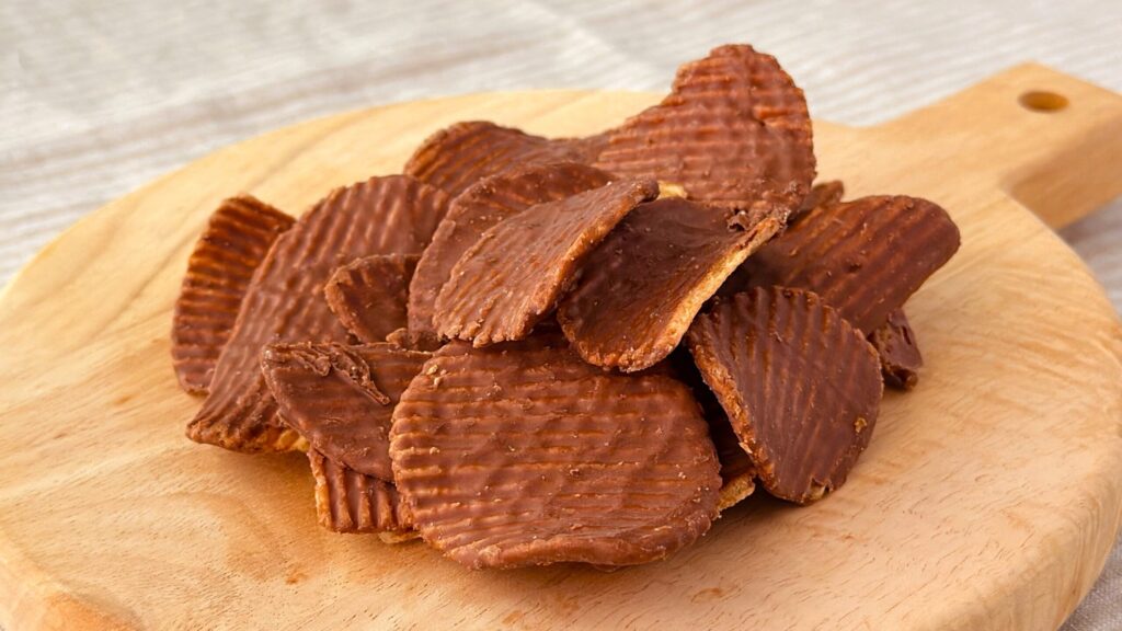 チョコレートの甘さは感じられるものの、まろやかでミルキーなコクに重きを感じる味わいです。ポテトチップス本来のじゃがいもの味わいもしっかりと感じられ、チョコレートのコクのなかにポテトチップスの旨みや塩気が溶け込んでいました。塩気や甘さよりも素材の味わいがしっかりと感じられるのが魅力です。