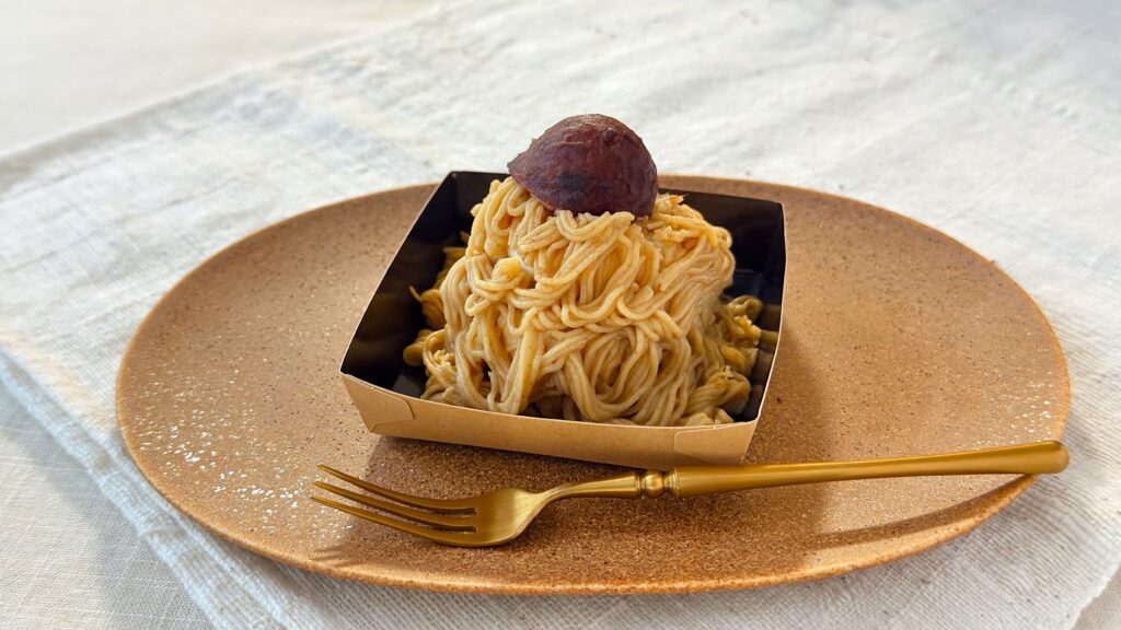 大粒の栗がトッピングされており、しっとりとした食感と上品な甘さが特徴です。生感のある糸状に細く絞られたモンブランクリームともマッチしており、クリーミーに広がる栗の風味とコクの広がる優しい風合いを感じられます。