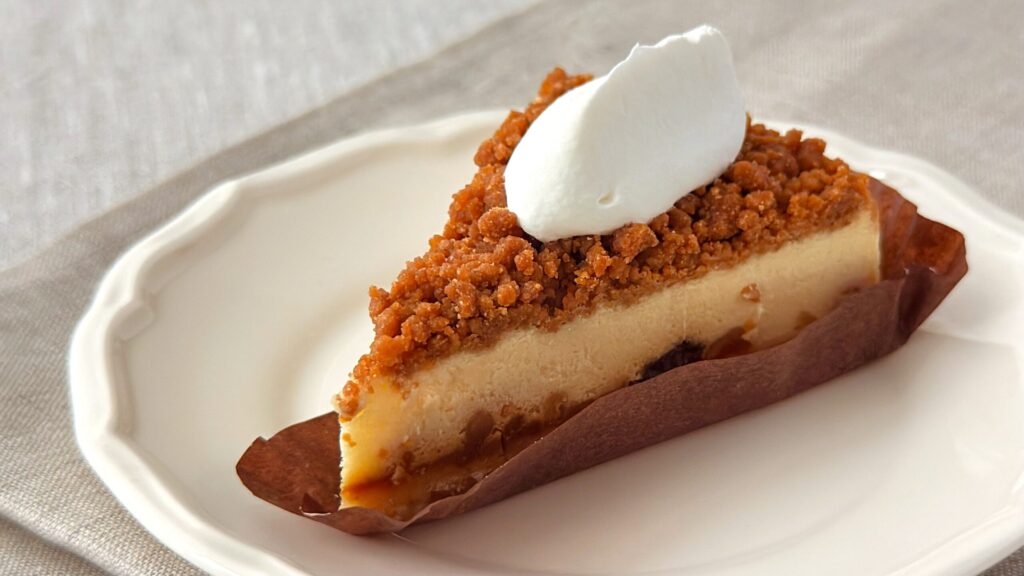 一番上にトッピングされているクランブルは、ふんわりとやさしいスパイス感を感じられるしっとり食感です。濃密感のあるチーズケーキ生地は、チーズ本来のコクが引き立っており、全体の味わいをまろやかに包み込んでいました。レーズンやナッツに、キャラメルフィリングのほろ苦さが重なることで、複雑でありながらリッチ感を満喫できる味わいが魅力です。