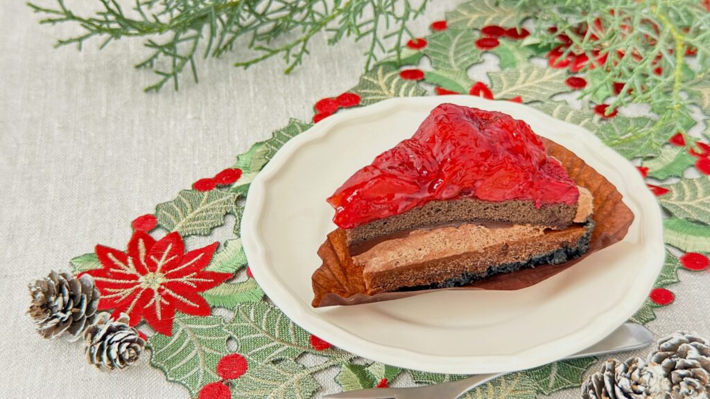 ごろっとしたいちごの果肉感や甘酸っぱさに、スポンジやクリーム、タルトが重なる落ち着いた甘さのチョコレートがマッチした味わいでした。見た目とのギャップがある落ち着いた甘さに加えて、コーヒーとの相性もいいので贅沢なカフェタイムを満喫できます。ぜひホリデーシーズンにぴったりなリッチなタルトケーキで、優雅なクリスマスのひと時を過ごしてみてください。